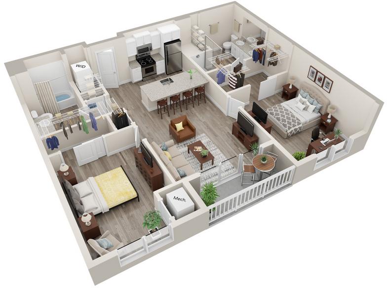 This spacious two bedroom floor plan offers 1,132 sq. ft of living space with a washer and dryer included in the apartment and a kitchen complete with all of the necessary stainless steel appliances and granite counter tops.