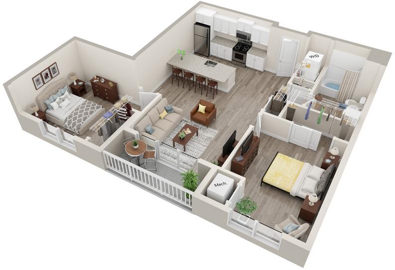 This spacious two bedroom floor plan offers 1,017 sq. ft of living space with a washer and dryer included in the apartment and a kitchen complete with all of the necessary stainless steel appliances and granite counter tops.