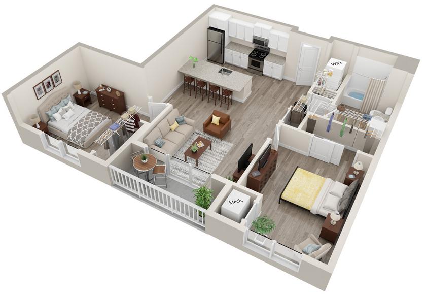 This spacious two bedroom floor plan offers 1,020 sq. ft of living space with a washer and dryer included in the apartment and a kitchen complete with all of the necessary stainless steel appliances and granite counter tops.